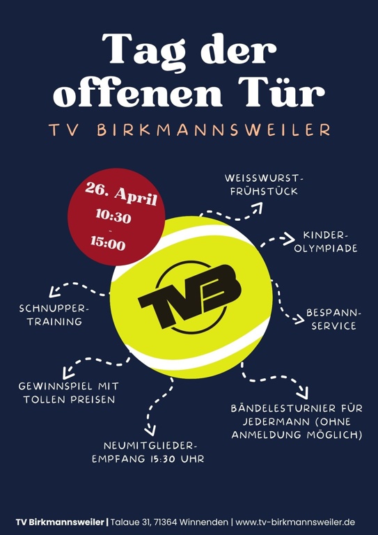 Kommt doch am Sonntag 26.4. zum Tag der offenen Tür und offiziellen Sandplatz-eröffnung beim Tennisverein Birkmannsweiler!
