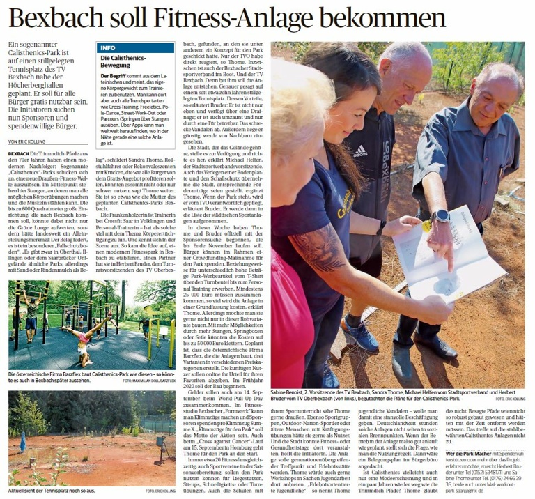 Heute am 28.08.2019 steht ein großer Bericht über unser Vorhaben Calisthenics Park Bexbach in der Saarbrücker Zeitung unter regionales.