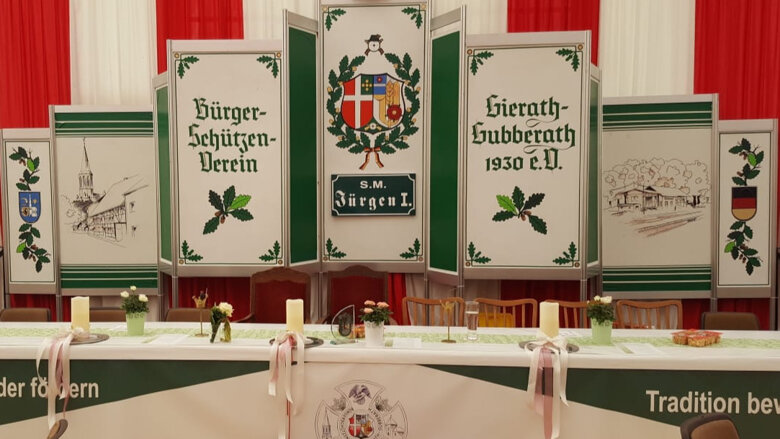 Bei Veranstaltungen im Festzelt wird die Bühne mit dem Aufbau einer Präsentationswand festlich geschmückt. An dieser Präsentationswand wird der amtierende Schützenkönig namentlich erwähnt. Desweiteren sind Darstellungen von historischen Gebäuden aus den Ortschaften zu erkennen.