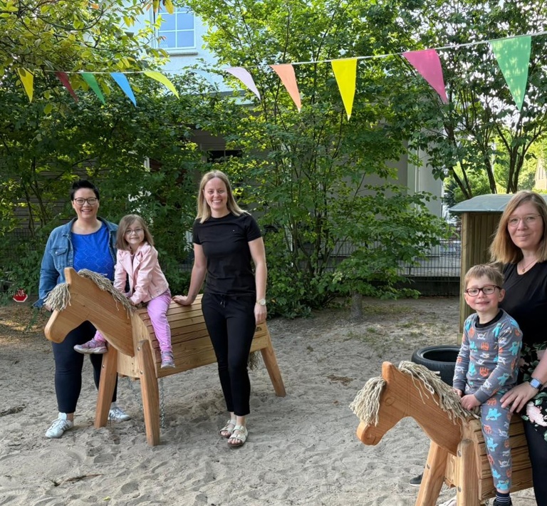 Mit großer Freude dürfen wir verkünden: Die Holzpferde mit den klangvollen Namen Schneesturm, Midnight und Regenbogen sind nun fest im Kindergarten eingezogen. Mit passendem Zubehör bereichern sie dort ab sofort im Außenbereich den Alltag als treue Spielgefährten und laden die Kinder zum Klettern, Reiten und fantasievollen Spielen ein.