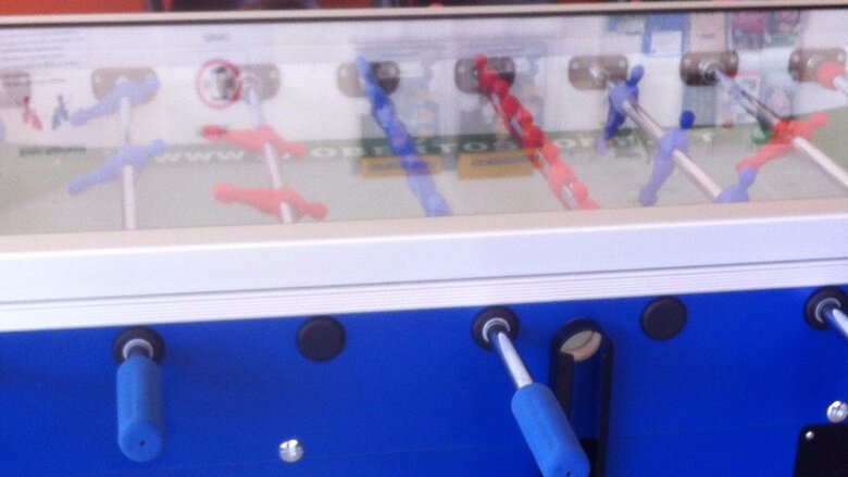 Diese für Schulen geeigneten Kicker-Tische sind mit einer Glasplatte bedeckt. Die Bälle können nicht entwendet werden.