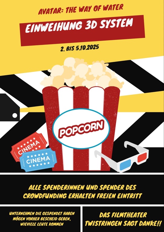 Ein herzliches Dankeschön allen, die uns unterstützt haben. Die neue Technik ist installiert, und wir laden alle Spenderinnen und Spender zu den Vorstellungen von AVATAR II vom 2. - 5.10.2025 ein.