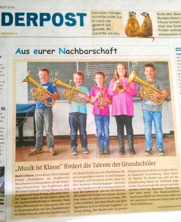 Gestern ist in der Westfalenpost ein großer Artikel über unser Projekt erschienen. Der Artikel zeigt mit großem Bild 5 Kinder der Musikklasse, die stolz ihre Instrumente präsentieren. Es werden auch die Initiatoren des Projektes gelobt, die die tolle Idee mit der Musikklasse hatten. An dieser Stelle möchte ich mich ebenfalls nochmal ganz herzlich bei Ingo Baumann, Dana, Jannis und André Hering für ihr Engagement bedanken!