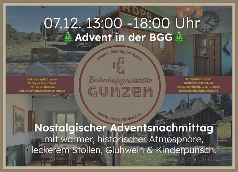 Herzliche Einladung zum NOSTALGISCHEN ADVENTSNACHMITTAG IN DER BAHNHOFSGASTSTÄTTE (BGG) GUNZEN am kommenden Sonntag, 07.12., dem 2. Advent, von 13 bis 18 Uhr. Schaut gerne vorbei!