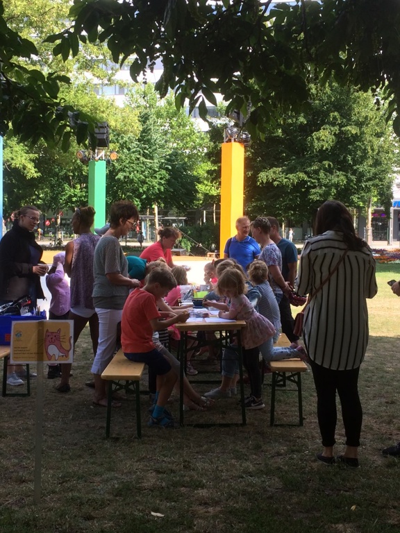 Alle Hände voll zu tun hatten die Organisatoren zum Beispiel am Sonntagnachmittag, als bis zu 40 Kinder bei bestem Sommerwetter an den beiden im Park aufgestellten Biertischgarnituren Malen wollten.