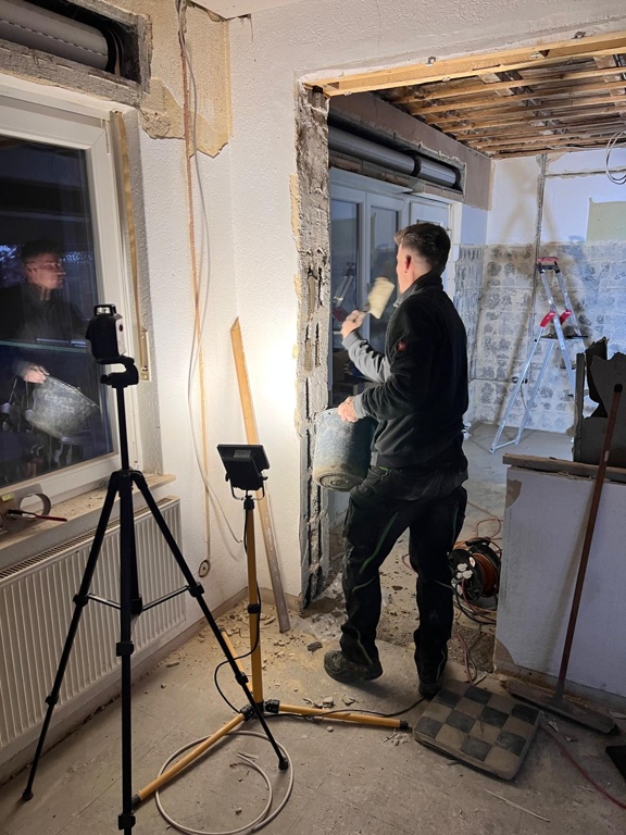 Des Weiteren haben wir Schlitze für die Stromleitungen an der Theke gefräst, einen Durchbruch im Thekenbereich Richtung Keller gestemmt sowie die Stromleitungen des großen Aufenthaltsraumes final gelegt.