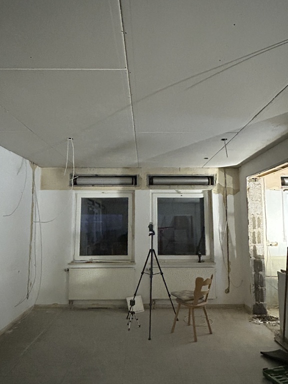 Positiv zu erwähnen ist, dass wir unser Zwischenziel, die Rigips Platten an der Decke anzubringen, erreichen konnten. Ebenfalls haben wir die Leitungen für die neue dimmbare LED-Beleuchtung gelegt.