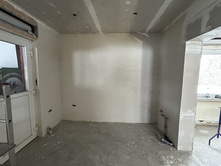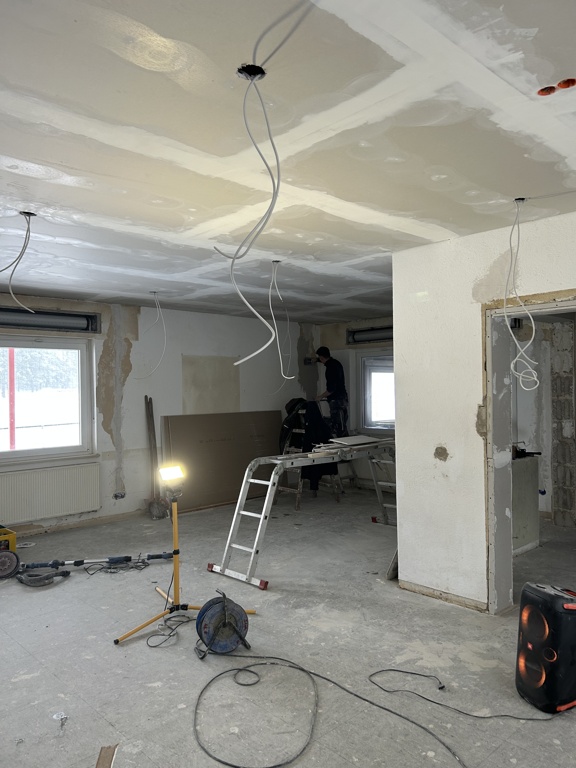 Die neue Decke wurde mehrfach gespachtelt und geschliffen, sodass in den nächsten Wochen grundiert und tapeziert werden kann.