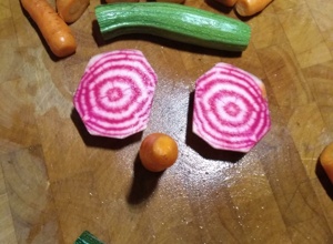 Kinder am Acker rohe Rote Beete, Mangold und Kapuzinerkresseblüten