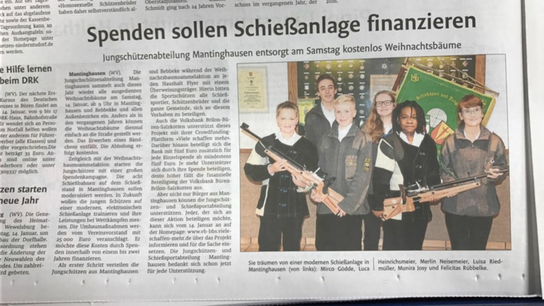 Hallo zusammen! Nun geht es also los, die spannendste Phase unseres Projektes beginnt. Die Jungschützen starten gleich morgen früh in dieses besondere Jahr für uns. Mit der Sammlung der Weihnachtsbäume in Mantinghausen und Rebbeke hoffen wir auf die ersten Spenden für unsere Schießbahnen. Auch die örtlichen Zeitungen haben bereits von uns berichtet! :)