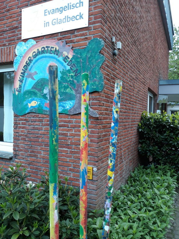 Unter demRegenbogen der Kita Eden stehen noch drei bunte Stäbe.