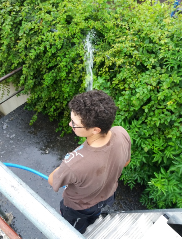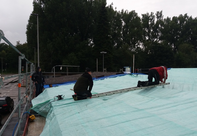Die Arbeiten begannen mit dem Abdecken des Dachs und der Entsorgung der Platten. Anschließend wurde das Holz erneuert und die neue Dachform gebaut. Nur kam dann der Regen. Mit Hilfe einer Folie wurde alles sauber abgedeckt. Leider konnte die Folie die vielen Wassermassen nicht verkraften und so wurde abends mit Pumpen und Eimern das Wasser aus der Folie gebracht. Man könnte sagen, nochmal gut gegangen. Vielen Dank an alle kurzfristigen Helfer!