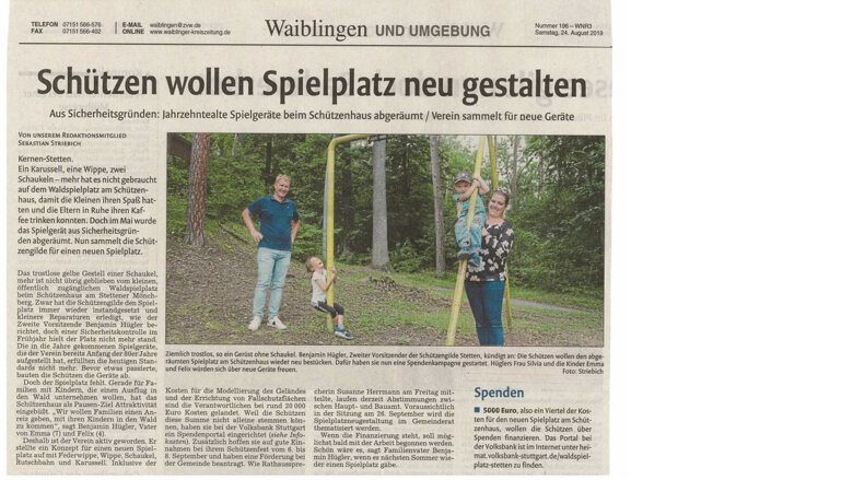 Um unseren mittlerweile in die Jahre gekommenen kleinen Waldspielplatz weiterbetreiben zu können, wollen wir diesen mit neuen Spielgeräten nach DIN EN1176 für den öffentlichen Bereich ausstatten. Nach den vor uns liegenden Angeboten belaufen sich die Kosten für die Neugestaltung mit Federwippe, Wippe, Schaukel, Rutschbahn und Karusell auf ca. 20.000€.