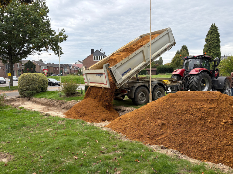 Heute beliefert uns RWE-Power mit 45 m³ Bergkies. Morgen werden wir das Material in der Grube verteilen und damit einen stabilen Unterbau für den Hauptweg zur Kapelle schaffen.